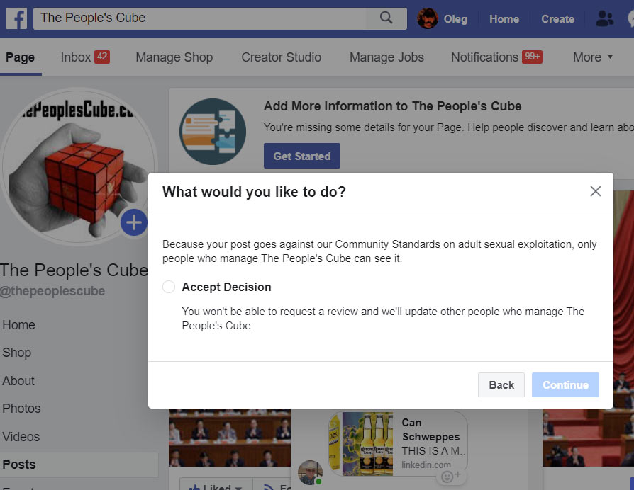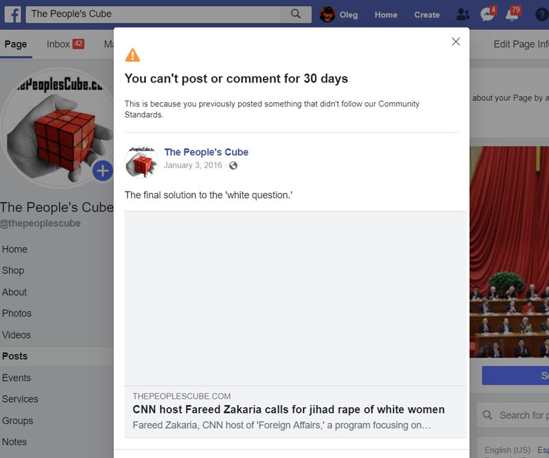 Almost four years later, on March 26, 2020, Facebook banned the People's Cube for 30 days for our 2016 Zakaria parody. Makes sense. No political bias, of course. They did it because our post "goes against our Community Standards on adult sexual exploitation." No word on what exactly their standards on adult sexual exploitation might be, so we can only guess.
